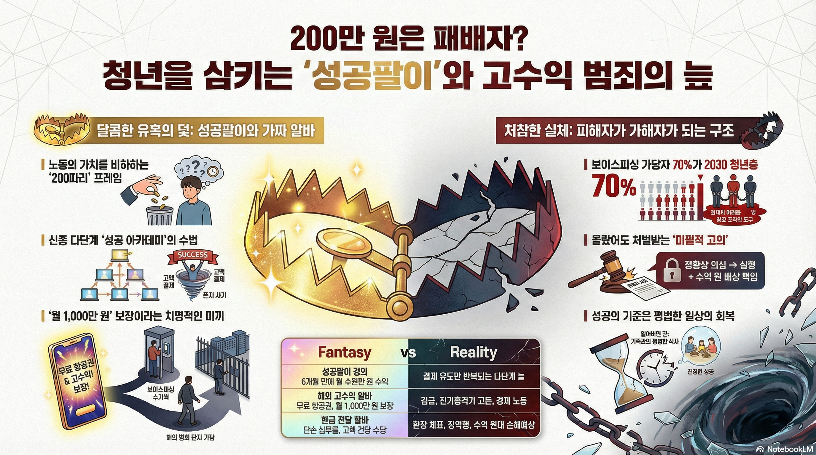 요즘 10대 청소년부터 사회 초년생까지 스마트폰 속 화려한 성공 신화에 무방비로 노출되어 있습니다. 영상 속 주인공들은 슈퍼카를 타고 해외 휴양지에서 여유를 즐기며 현금 뭉치를 보여줍니다. 그들은 말합니다. "공부가 적성에 안 맞으면 이 영상을 봐라", "성공하기 너무 간단한 시대다, 본인의 노력만 있다면 절대 실패할 수 없는 구조다"라고 말이죠.