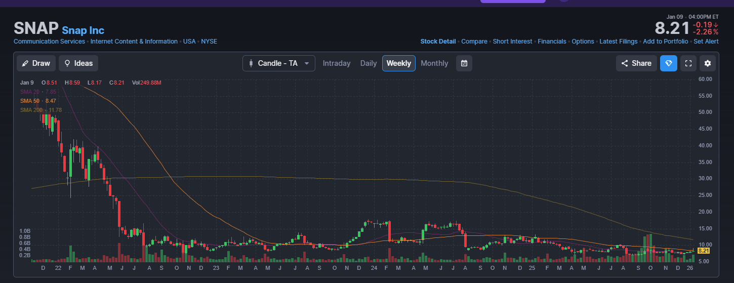 주식 시장에서 가장 무서운 단어 중 하나인 MDD 90%. 스냅은 2021년 고점 대비 약 91% 하락한 상태로 거래되고 있습니다.