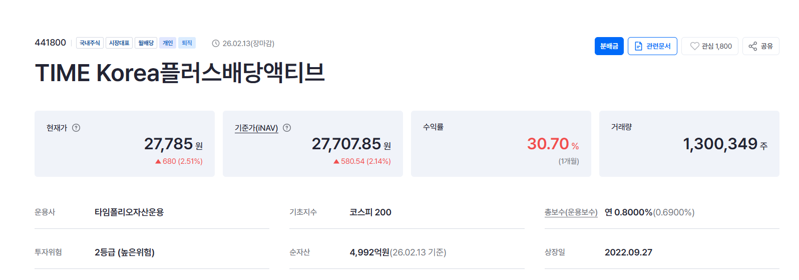 그중에서도 눈에 띄는 게 '타임폴리오 코리아플러스배당액티브'(일명 코플배)이에요.