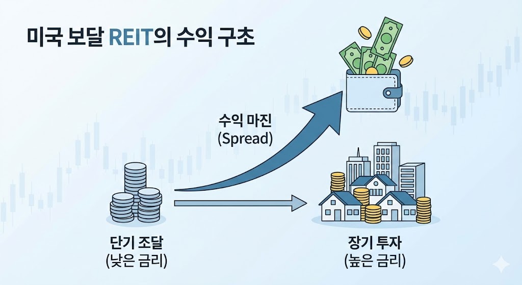 이게 뭐냐면요, 쉽게 말해 돈을 빌려주고 이자를 받는 회사에 투자하는 거예요. 미국은 모기지(주택담보대출) 시장이 엄청나게 크잖아요? 이 리츠 회사들은 단기로 돈을 빌려와서 장기 모기지 채권에 투자해 그 '금리 차이(Spread)'를 먹습니다.