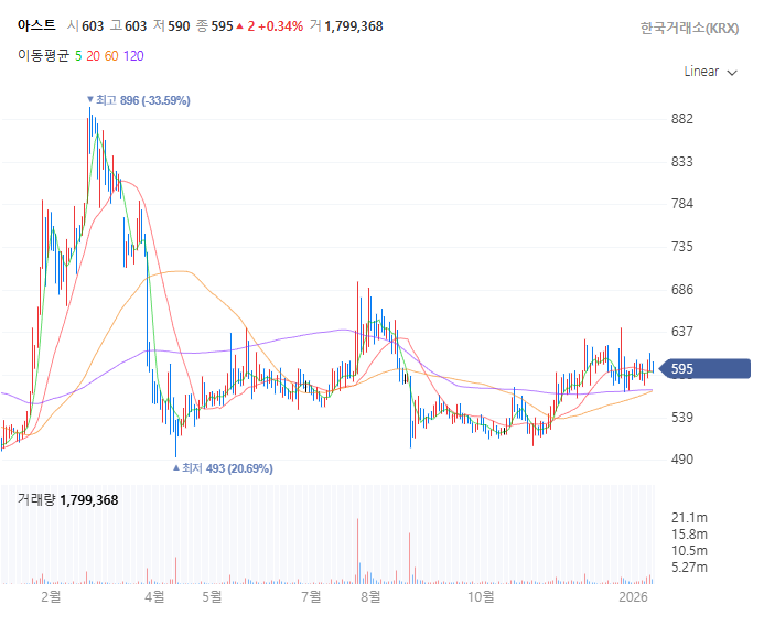 현재 아스트의 주가는 역사적 저점 부근인 500원대에서 강력한 하방 경직성을 보여주고 있습니다.