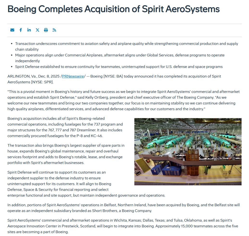 2. 보잉의 '스피릿' 인수 완료와 공급망 직속 편입 (2025.12.18 공시)