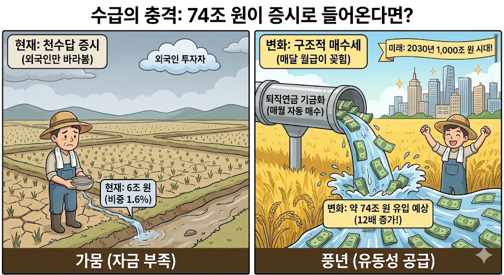 단순 계산으로도 현재보다 12배 이상의 자금이 국내 증시로 들어오게 됩니다. 이는 외국인이 사주기만을 기다리던 '천수답 증시'에서, 매달 월급이 꽂히며 기계적으로 주식을 사들이는 '구조적 매수세'가 생긴다는 것을 의미합니다.