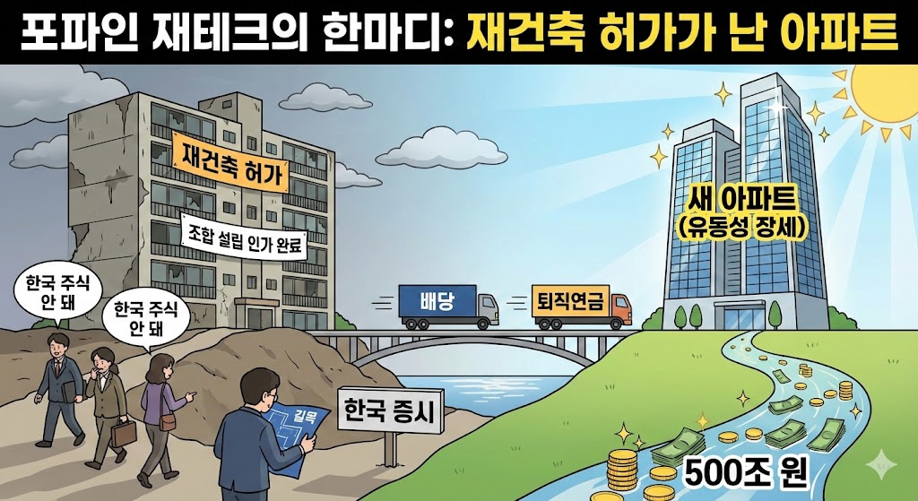 지금 한국 증시는 '재건축 조합 설립 인가'가 난 낡은 아파트와 같습니다. 아직 공사는 시작되지 않았고 건물은 낡았습니다. 하지만 '새 아파트(유동성 장세)'가 될 것이라는 계획은 확정되었습니다.