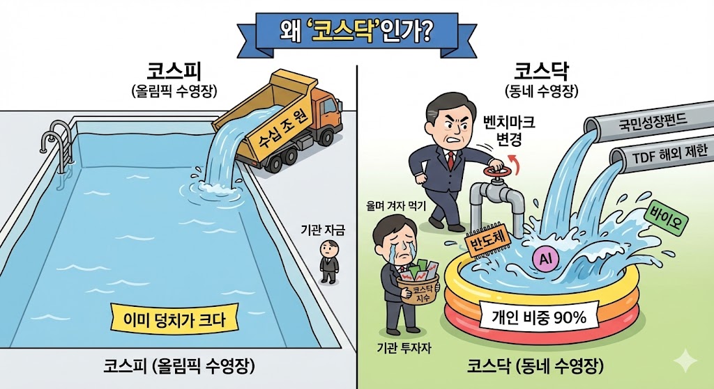 정부는 국민성장펀드(150조)와 TDF 해외 투자 비중 제한 등을 통해 이 자금을 반도체, AI, 바이오 등 코스닥 우량주로 유도하고 있습니다.