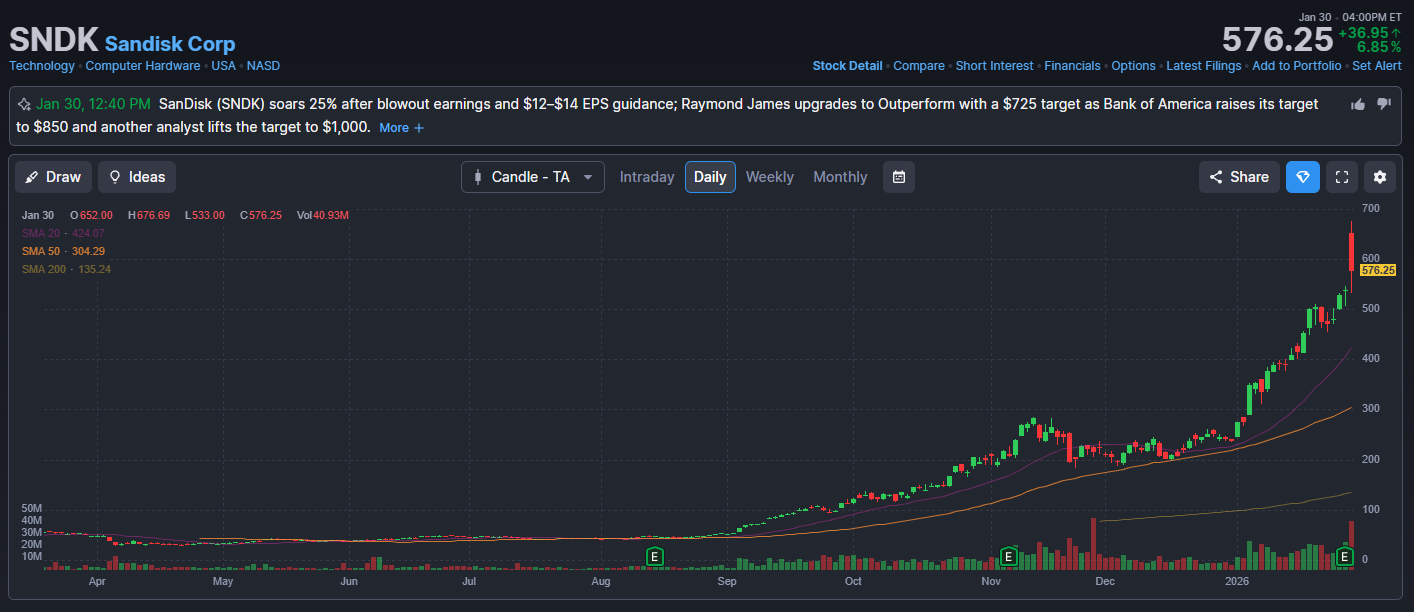 안녕하세요! 오늘은 나스닥 창을 켜자마자 눈을 의심하게 만든 종목, 샌디스크(SNDK) 이야기를 안 할 수가 없네요. 차트 보이시나요? 하루 만에 갭상승으로 신고가를 뚫어버리더니, 주가가 무려 $576를 찍었습니다.