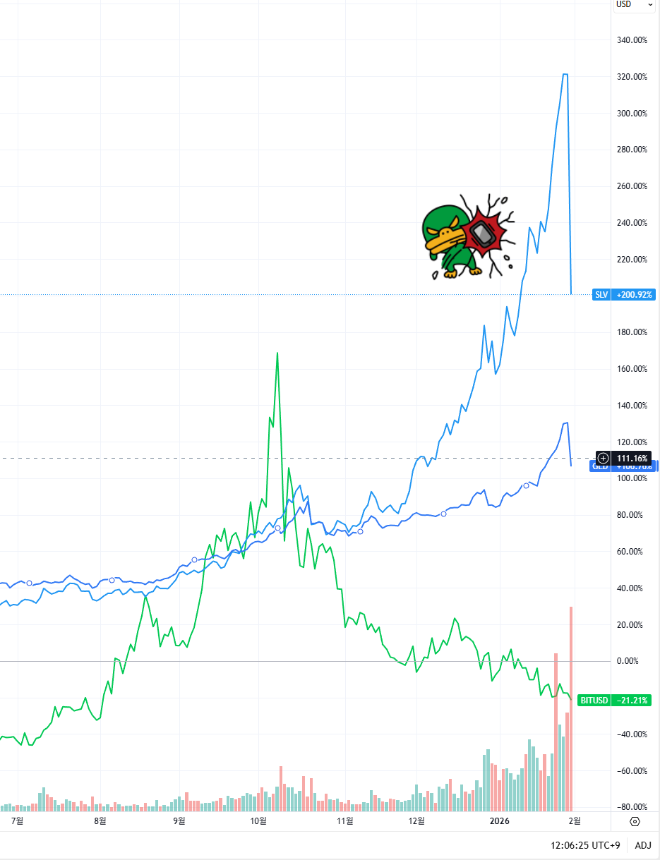 GLD, SLV, BITCOIN 충격 / 출처: TRADING VIEW