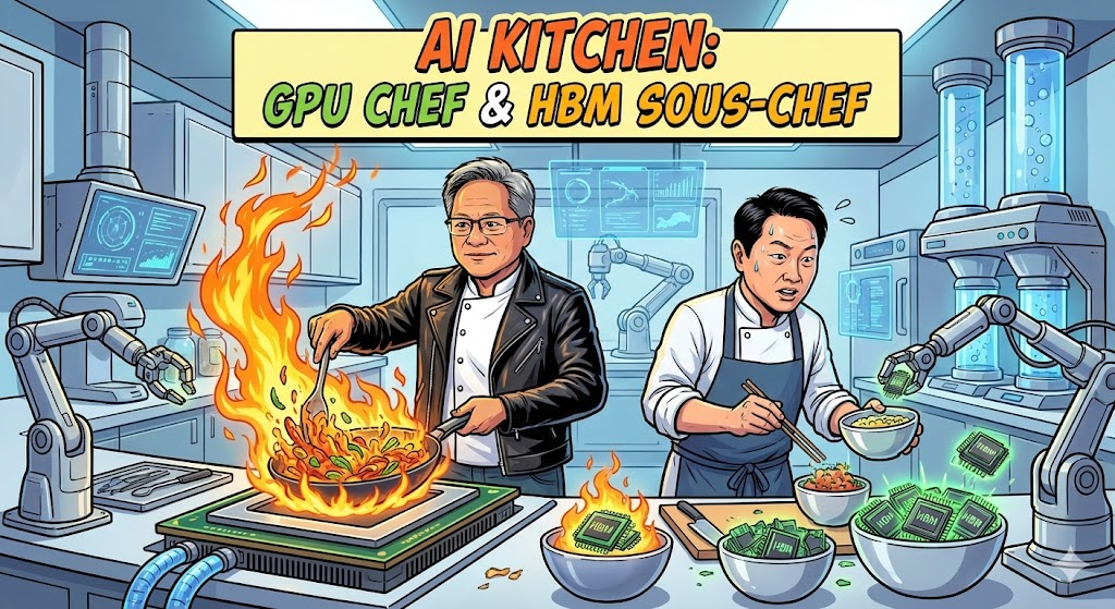 AI의 두뇌인 GPU(그래픽 처리 장치)가 '천재 요리사'라면, HBM은 요리사 옆에서 식재료(데이터)를 쉴 새 없이 손질해서 건네주는 *보조 셰프'입니다. 아무리 요리사 손이 빨라도 재료가 늦게 오면 요리를 못 하겠죠? 그래서 HBM은 일반 메모리보다 데이터가 다니는 길(대역폭)을 수천 개 뚫어 속도를 맞춥니다. 그런데 이 보조 셰프가 일을 너무 열심히 하다가 열이 펄펄 나고 지쳐버리면 어떻게 될까요? 주방 전체가 마비됩니다. 즉, HBM이 열을 받지 않고 꾸준히 데이터를 줘야 AI 전체 성능이 유지되는 핵심 키(Key)인 것입니다.