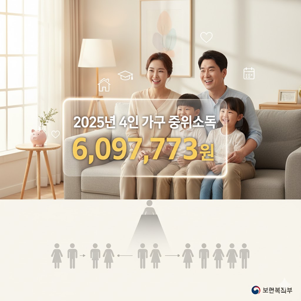 가장 표준적인 가족 형태로 꼽히는 4인 가구의 경우, 2025년 기준 중위소득은 약 609만 7,773원입니다. 영상에서는 기억하기 쉽게 약 609만 원으로 소개되었습니다.