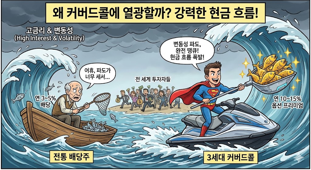 금리가 높고 시장이 출렁일수록 옵션 값(보험료)이 비싸지기 때문에, 지금 같은 시기에 커버드콜은 전통 배당주보다 훨씬 강력한 현금 흐름을 만들어냅니다.