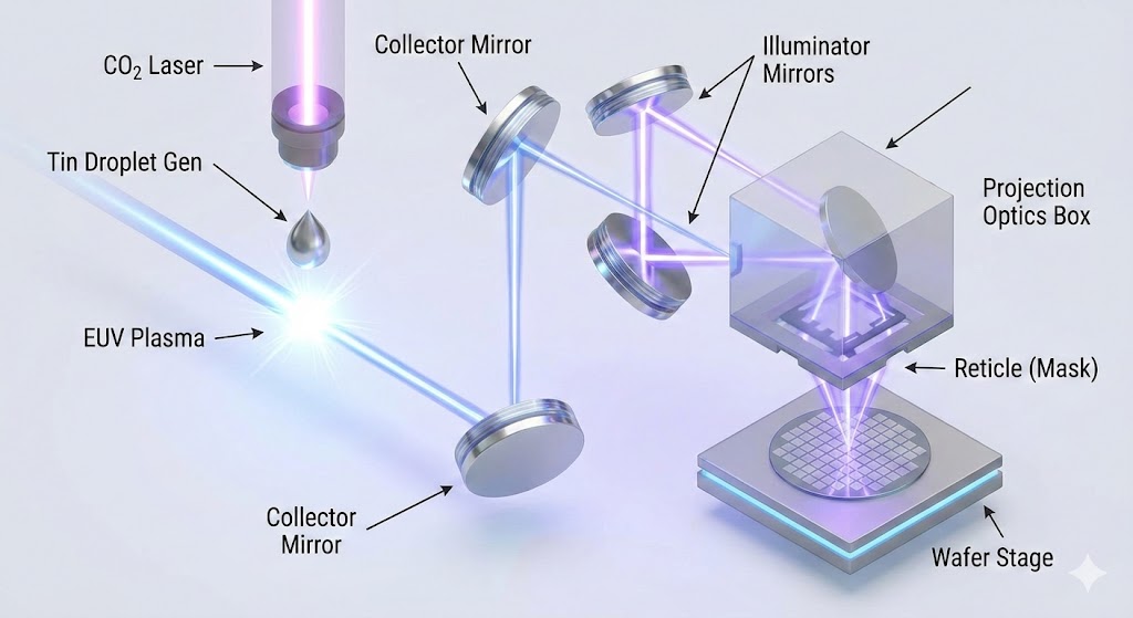 - 이 빛을 독일의 **자이스(Zeiss)**사가 만든, 지구상에서 가장 평평한 거울(반사경)들을 통해 여러 번 반사시켜 웨이퍼에 도달하게 합니다.
