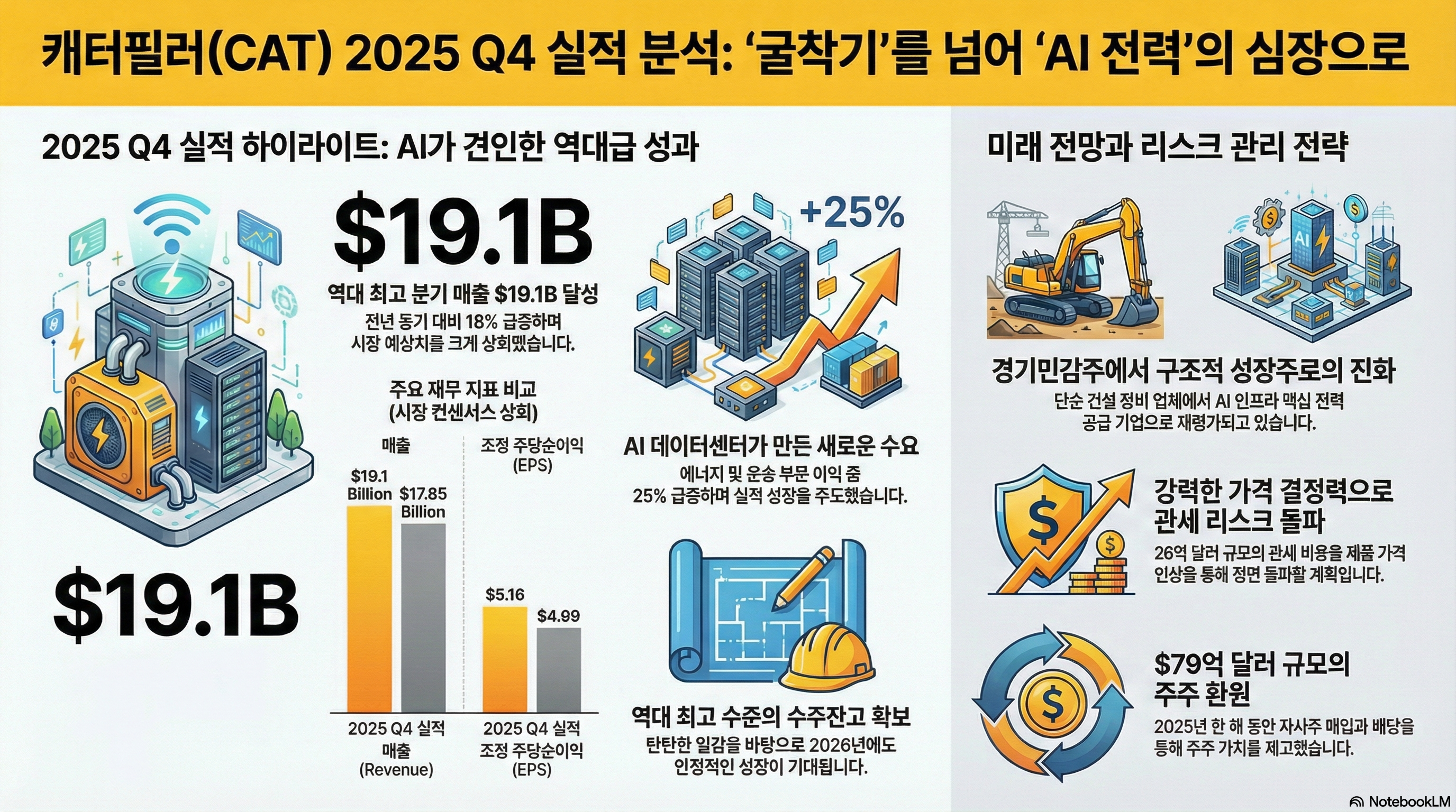 - 매출 효자 등극: 이 부문의 이익이 전년 대비 25%나 점프하며 전체 실적을 견인했습니다. 이제 캐터필러는 단순한 '굴뚝주'가 아니라 AI 인프라 확장의 숨은 수혜주로 평가받고 있습니다.