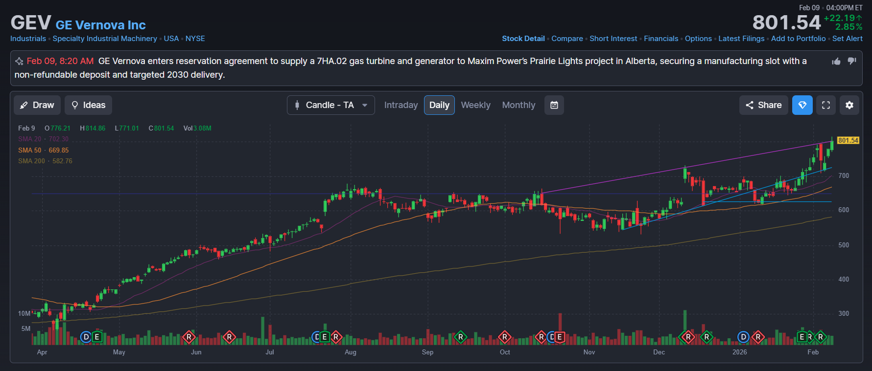 백문이 불여일견이죠. 현재(2026년 2월 9일 장 마감 기준) GEV의 주가 흐름과 쏟아지는 최신 뉴스를 보면, 제가 앞서 말씀드린 '공급 부족' 현상이 얼마나 심각한지 체감할 수 있습니다.