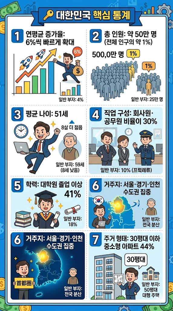 - 직업 구성: 회사원·공무원 비율이 30% (일반 부자는 10%)