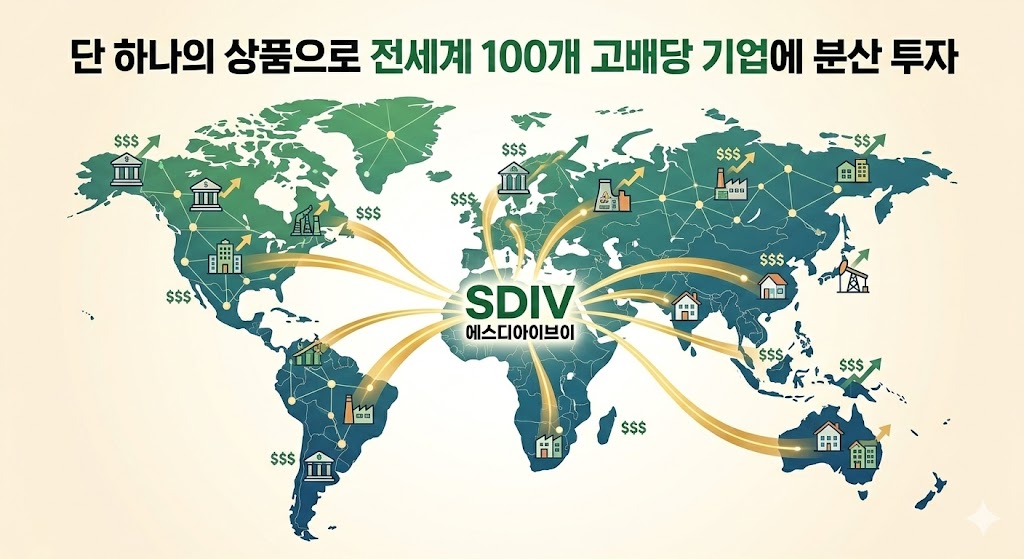 SDIV ETF는 "전세계에 부동산 월세 받는 느낌"을 주는 독특한 상품이에요. 단 하나의 ETF로 미국, 유럽, 아시아, 신흥국까지 100개 배당주에 분산 투자하고, 매달 8.86%의 배당을 받을 수 있으니까요! 💰