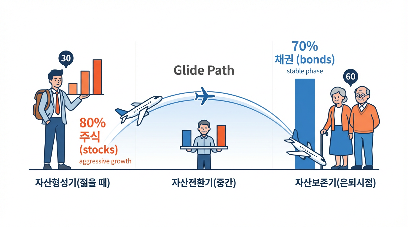 TDF의 글라이드 패스가 바로 이 원리입니다. 여기서 '고도'는 '위험자산(주식)의 비중'을 의미합니다. 은퇴라는 착륙 지점까지 남은 시간에 따라 고도를 조절하는 것이죠.