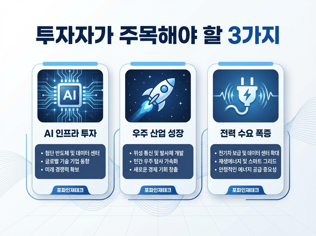 - 투자자는 AI 인프라, 우주 산업, 전력 인프라에 주목